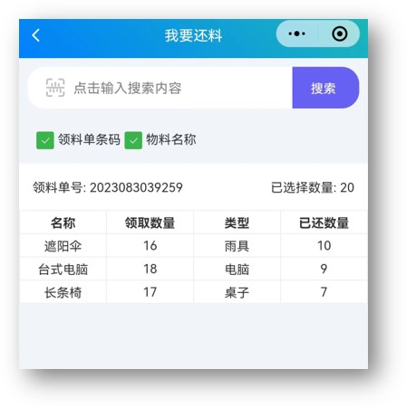物料分为领取和借用, 领取的物料无需归还, 借用的物料则必须归还, 每个部门每个用户生成不同的领还记录, 方便随时可查。